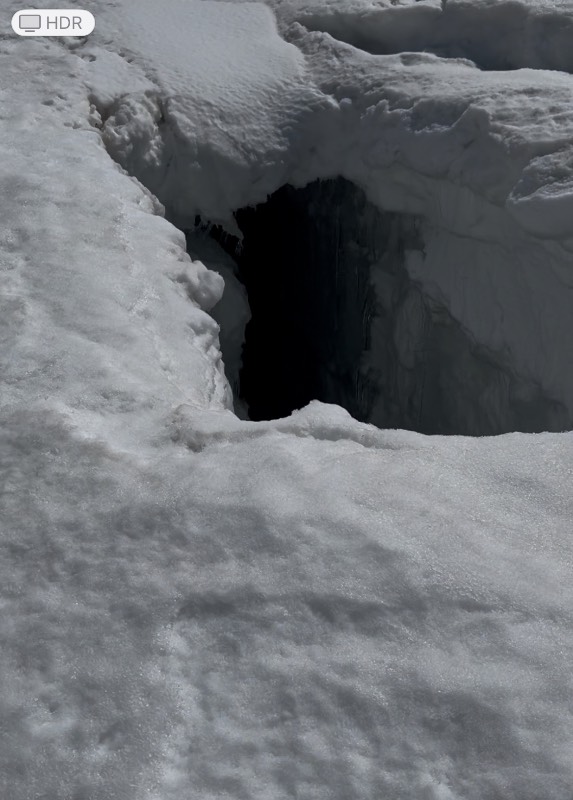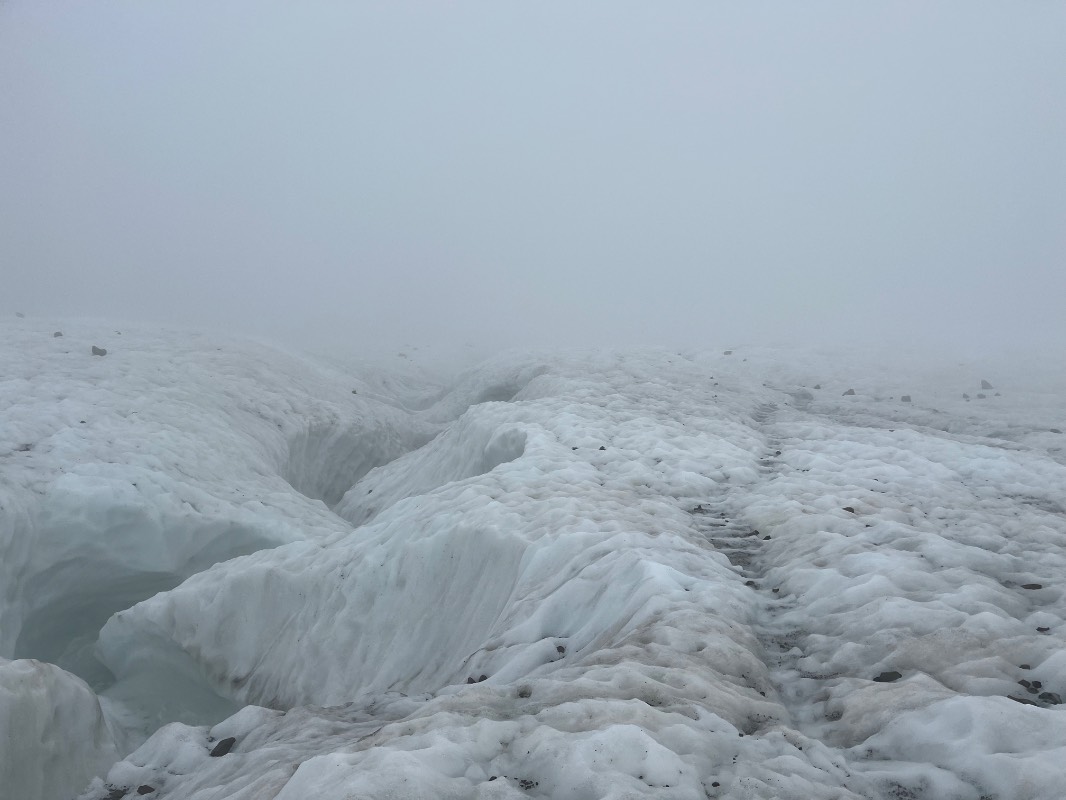 Лето жаркое- ледник плывет. Передо мной другие люди по пояс проваливались в воду, пока его пересекали.