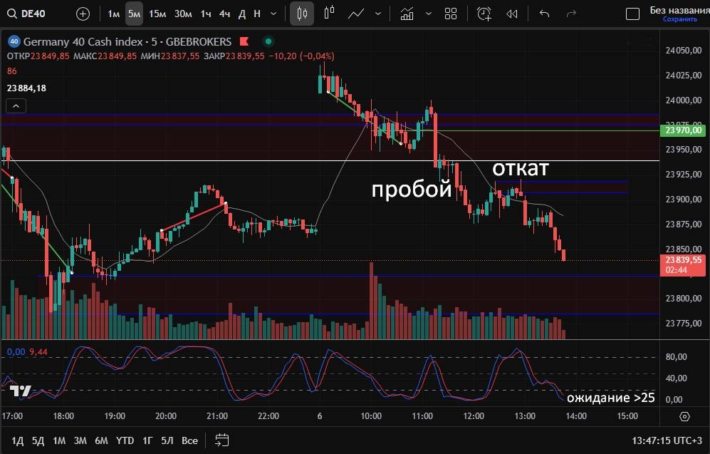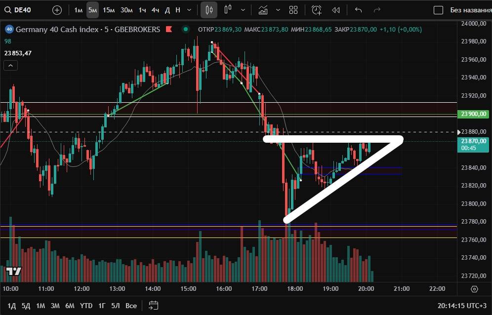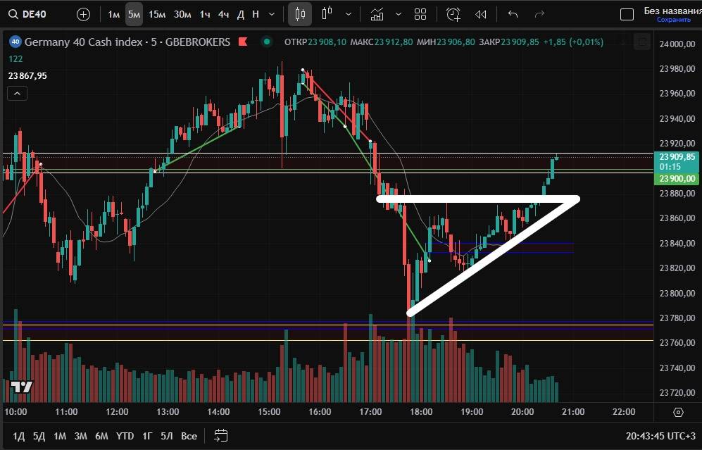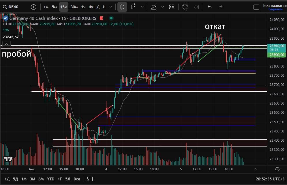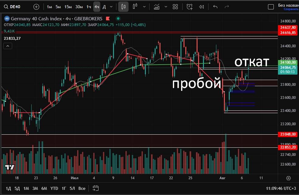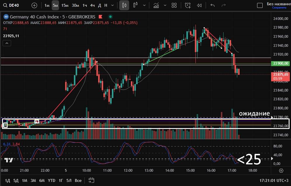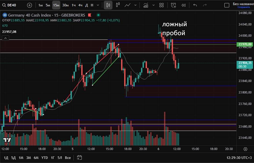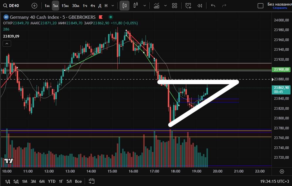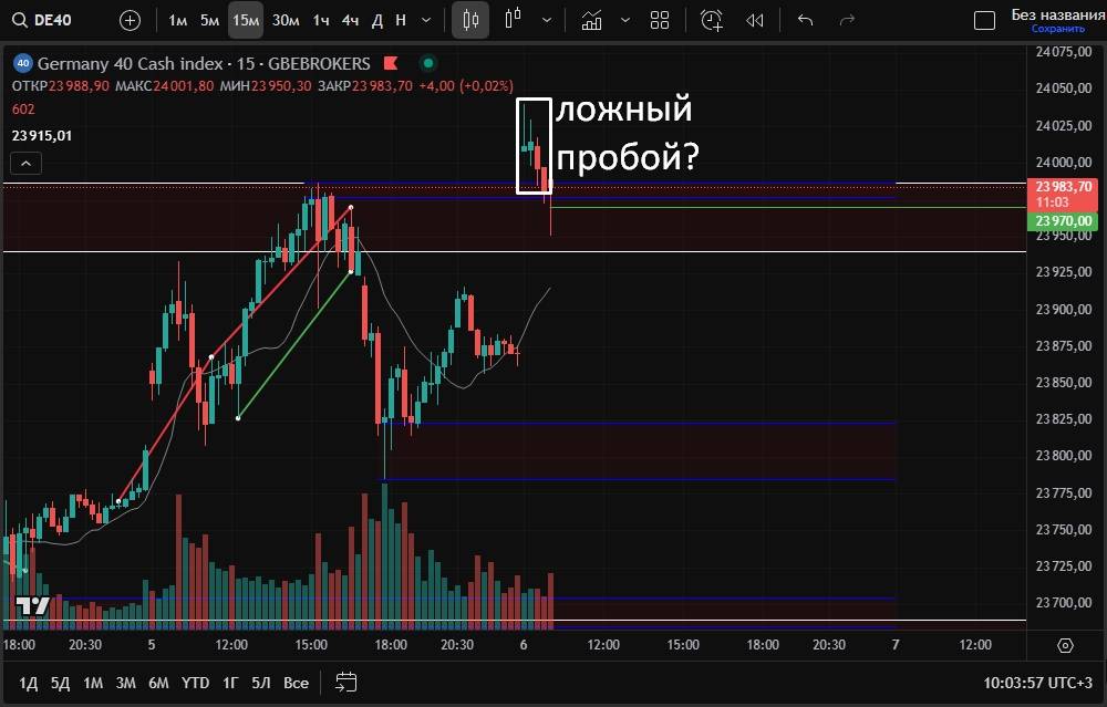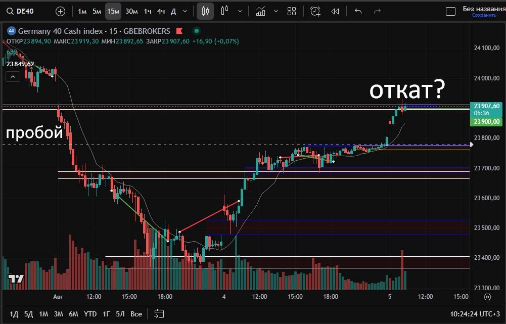 Пробой пятничного максимума 23900-23920 и мне очень повезёт, если пробой окажется ложным, а на Америке на фоне новостей хорошо бы видеть мощное падение, ибо с августа немцы в нисходящем тренде (дневной и недельный тренд)