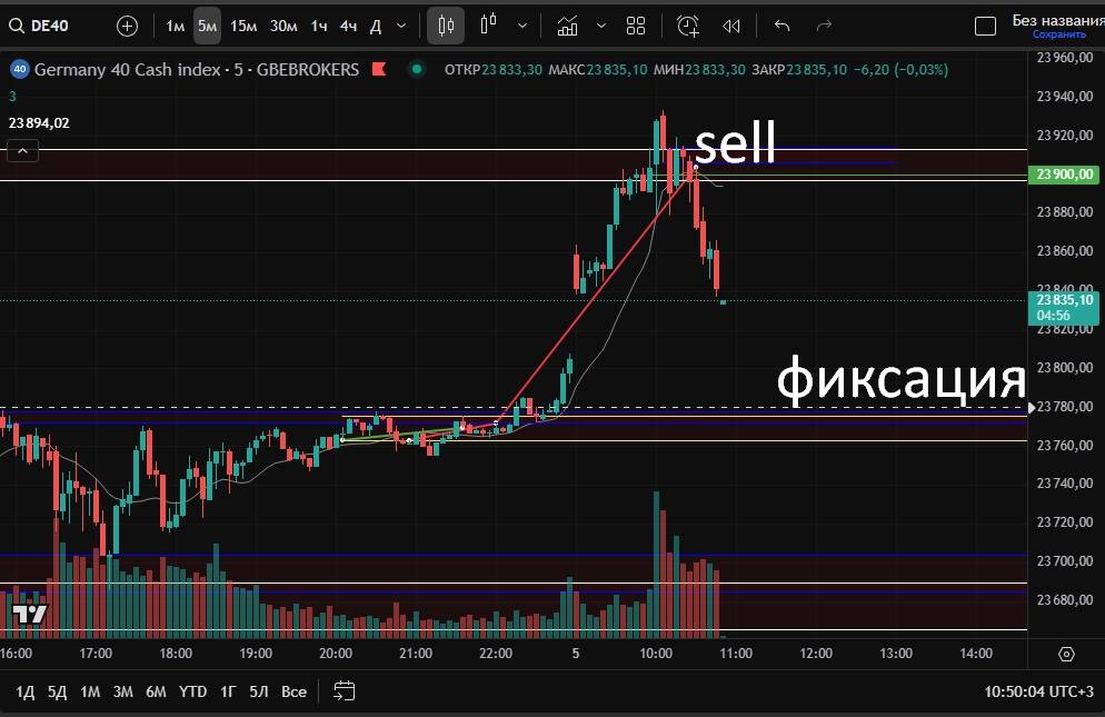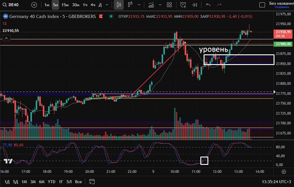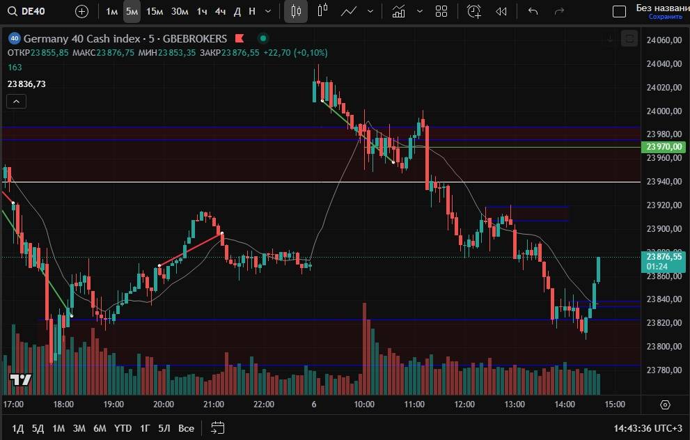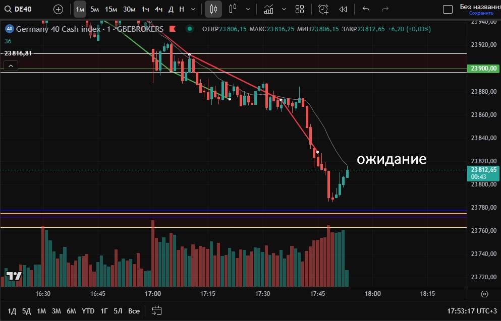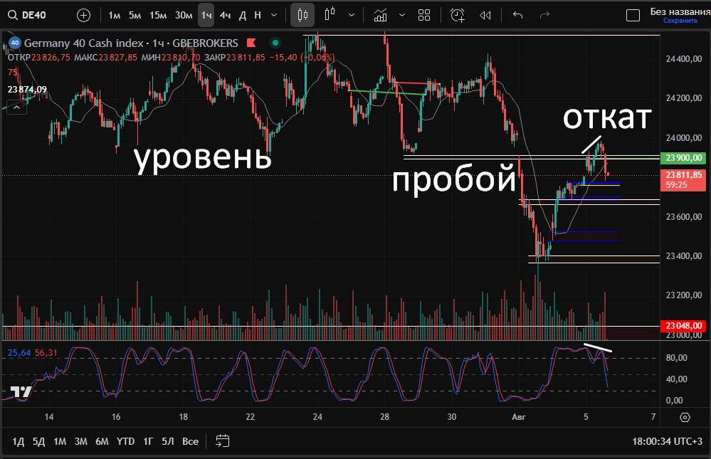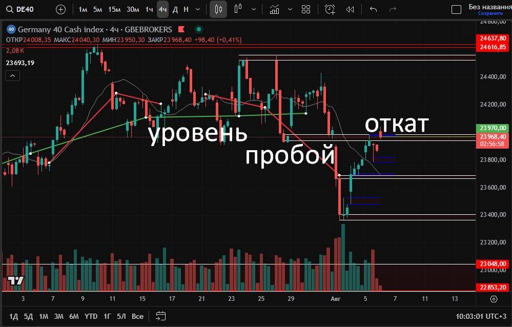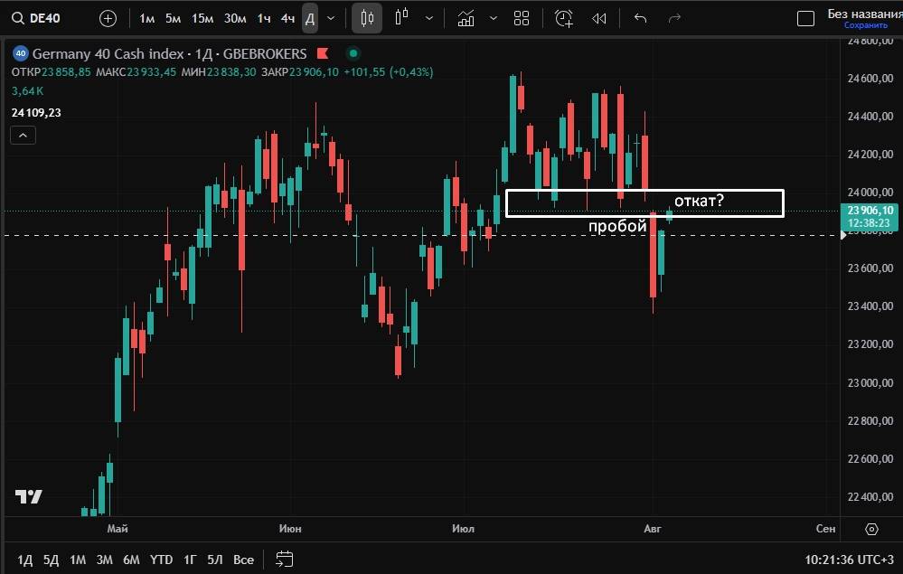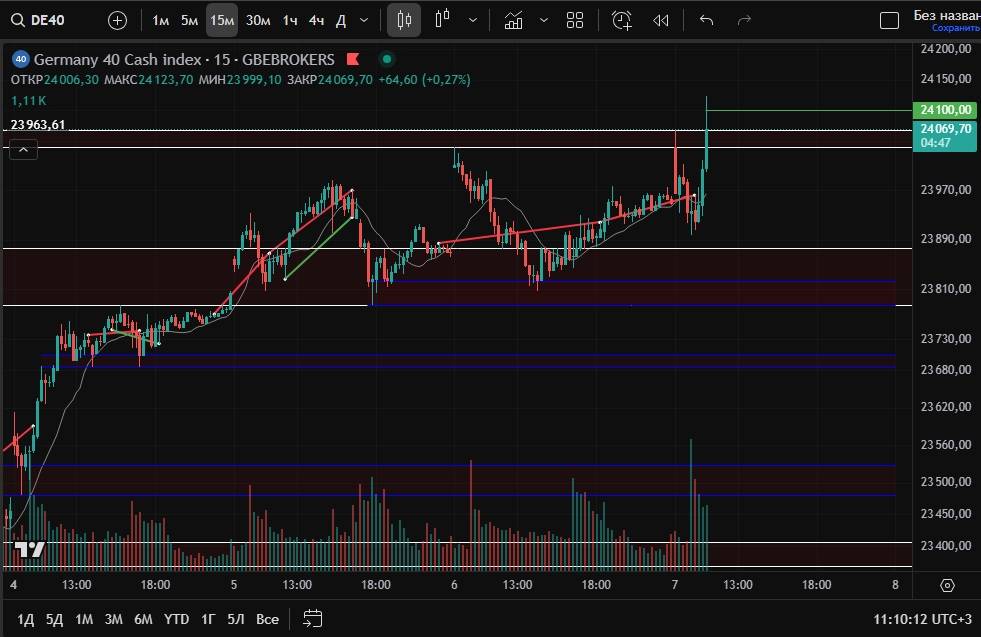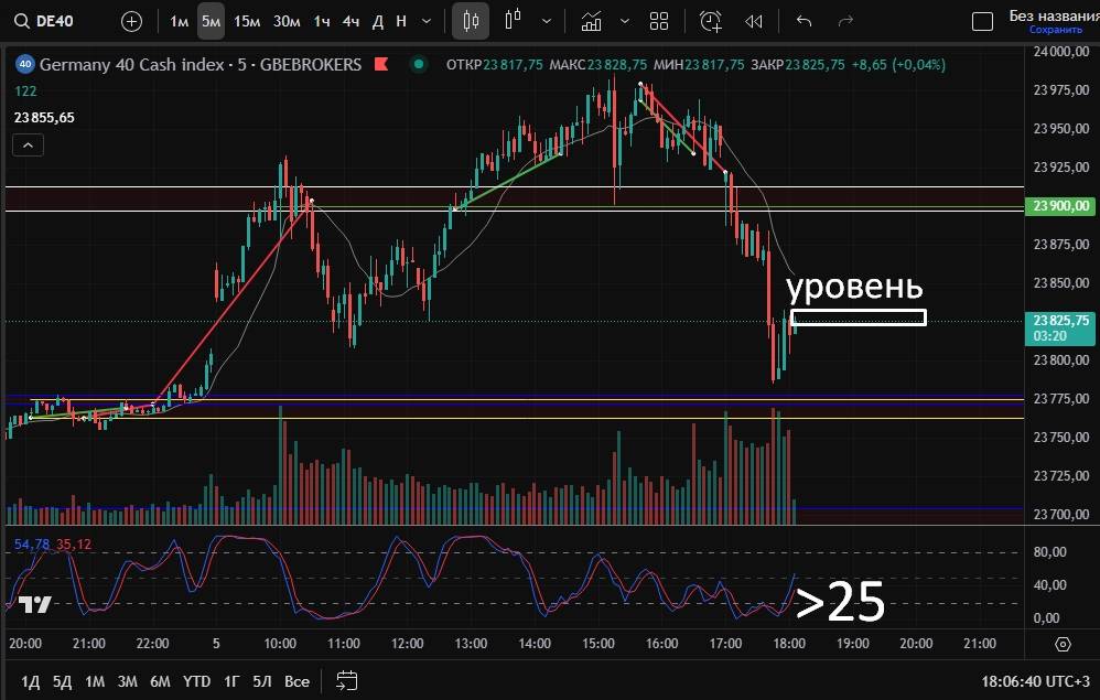 Пробой пятничного максимума 23900-23920 и мне очень повезёт, если пробой окажется ложным, а на Америке на фоне новостей хорошо бы видеть мощное падение, ибо с августа немцы в нисходящем тренде (дневной и недельный тренд)
