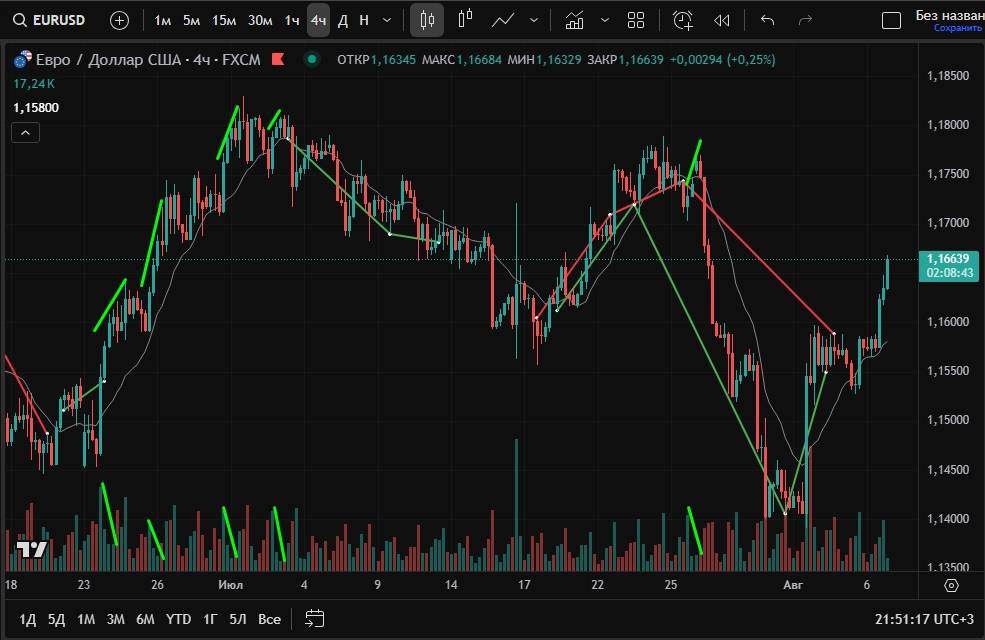 Рост цены при пониженном объеме торгов может указывать на слабость текущего тренда и потенциальную возможность коррекции или разворота.