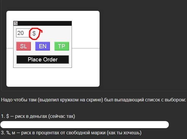 ОригиналМогу ошибаться, но тестируя изначальный вариант я обратил внимание, что сделка открывается на всю маржу. Ясное дело мне иначе надо. Но при этом я открываюсь байстопом и селстопом и мне тоже важно окно с указанием суммы в долларах (процент риска и сам могу посчитать) и вот 1% от 1000 будет $10 и ставлю в советник $10, а в маржу ПРЕДЕЛ 10% и ставлю байстоп и стоплосс и далее советник откроет нужный лот.