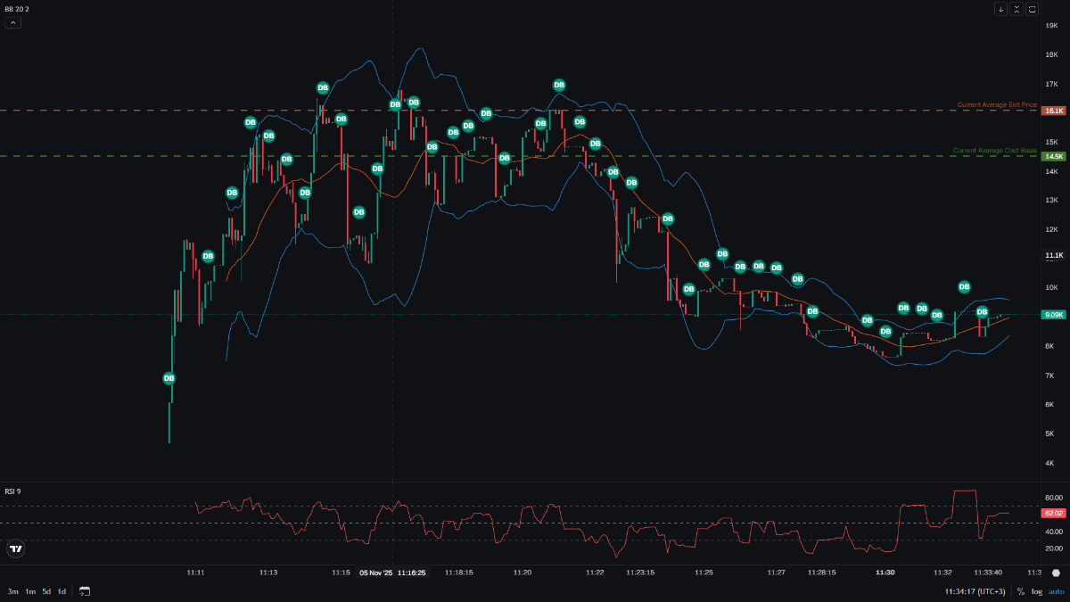 ТФ 5 секунд в стандартном боллинджере + rsi 9. входы все по классике. отскоки от средней и нижней границы болли. автостоп стоит на 50%, я его потом руками подтягиваю под входную свечку.