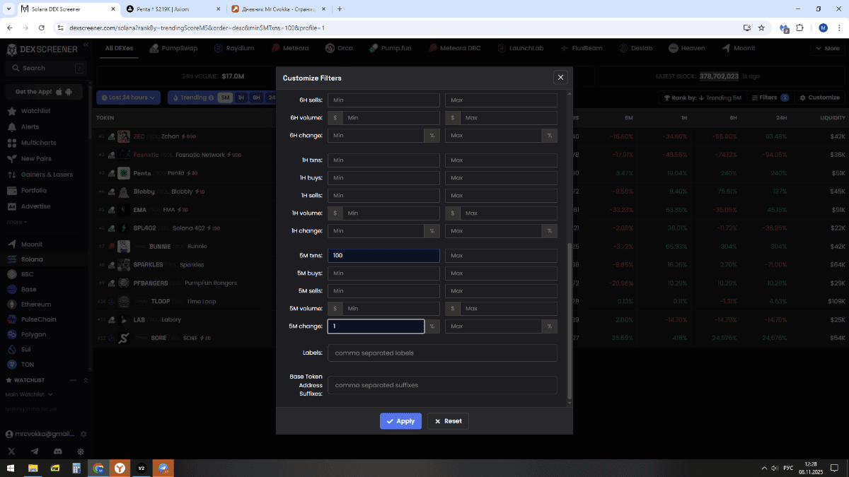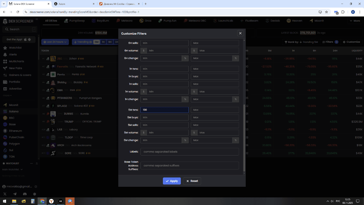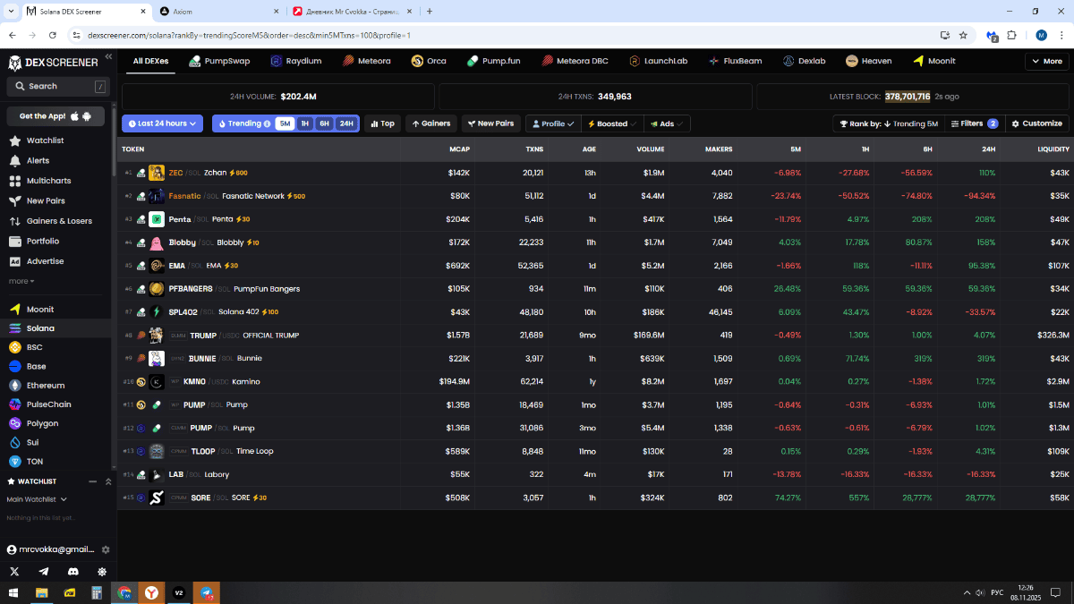 3. Зачастую монеты, которые показывают хорошее направленное движение пролетают мимо меня. хотя в определенные моменты своей жизни соответствуют фильтрам в аксиоме. что за баг не понятно. но факт на лицо. ни одного паровоза со старта и до 500к я не то что отторговать, а даже увидеть не смог.