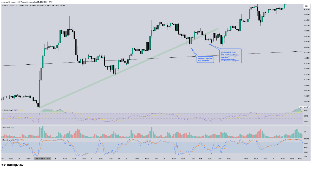 далее началось сопровождение сделки, и тут все пошло не по плану.. я ожидал движение цены к цели без слома трендовой линии, но сделку пришлось закрыть с небольшим профитом: