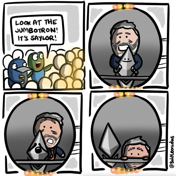 В данном случае обыгрывается как Майкл Сейлор — биткоин фанатик — на самом деле втайне милуется с эфиром и в ужасе что его спалили, как ту