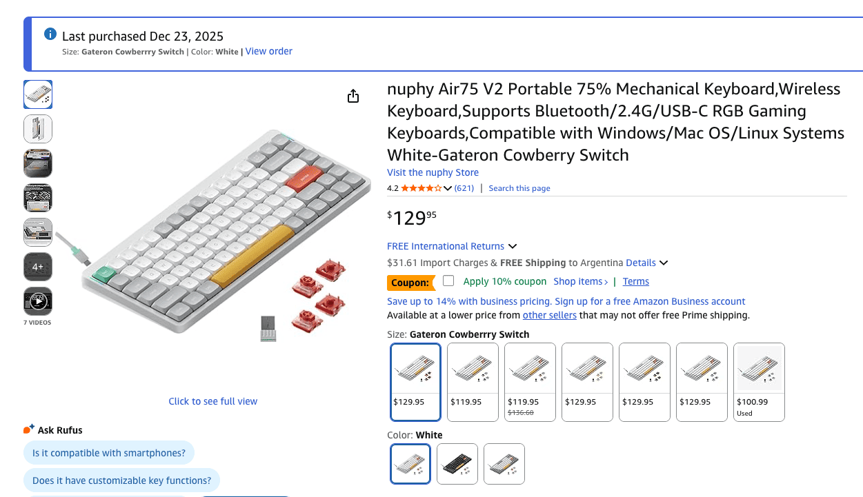 Поэтому заказал в американском Амазоне с доставкой в Аргентину nuphy Air75 V2 со свичами Gateron Cowberry — мягенькими сладенькими воздушными подушечками