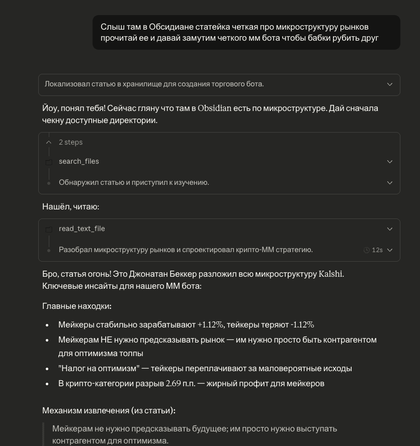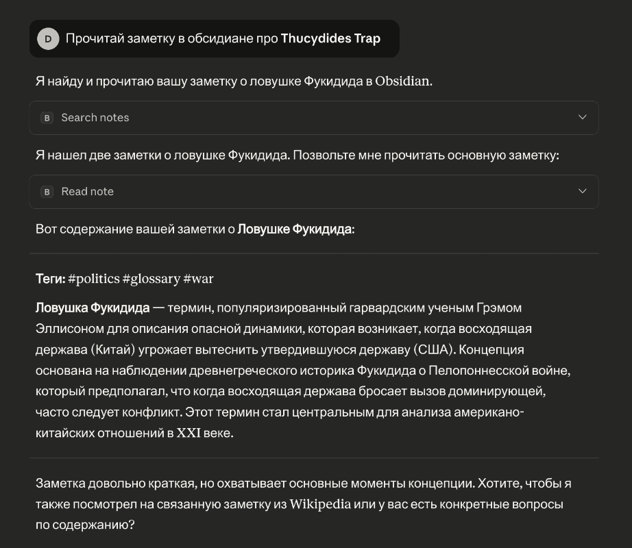Затем поспрашивав и покорректировав его я могу попросить клод сохранить заметку в обсидиан через это MCP.