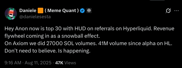 **Итоговая мысль:** — Мы на пороге новой эпохи **AI-эффективности в крипте**. — 2000 активных пользователей из 2400 — это очень сильный retention. — HUD торгует **лучше 99% крипто-Twitter**.