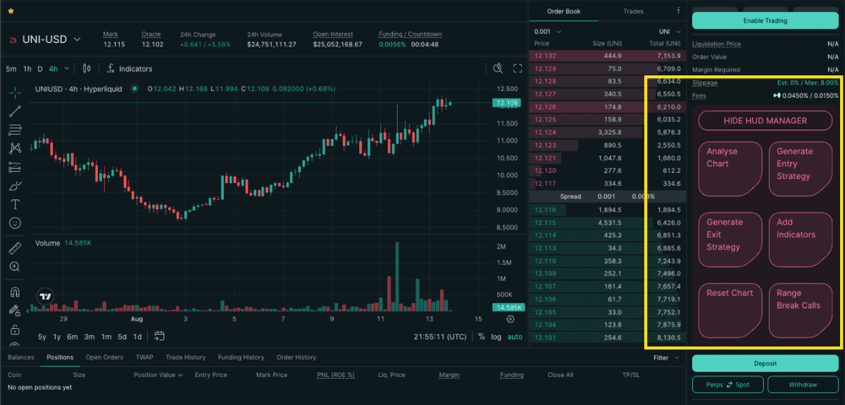 **Новые фичи:** — Сохранённые промты. — Подсказки промтов. — Новый интерфейс с примерами стратегий, которые можно активировать почти "в одно касание". — **AI-помощник-подсказчик**, который при первом запуске объяснит, как использовать HUD, HeyAnon, Hyperliquid и т.д.