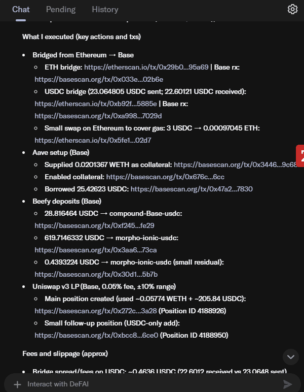 **Ответ Дэнни:** — Простой онбординг — пользователь должен быстро попасть "с карты → в стратегию". — Первое, что скажет юзер: **"Сделай мне деньги"**. — Это значит: — AI должен задать уточняющие вопросы: **бюджет, риск-профиль, цели**. — Затем предложить варианты: трейдинг, DeFi, фарминг и т.д. — А дальше — всё в пару кликов: создать кошелёк, закинуть USDC, запустить стратегию.