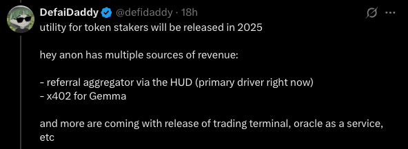 — HeyAnon имеет **низкий burn rate**, но высокую казну. — План: — Часть дохода идёт на **обратный выкуп и сжигание** токенов ANON. — Часть — в **казну**, если она владеет, например, 20–30% предложения. — Остальное — на **вознаграждения и развитие**. — Будет **голосование**, чтобы решить детали. — Модель уже доказала эффективность (пример — Abracadabra, Spell).